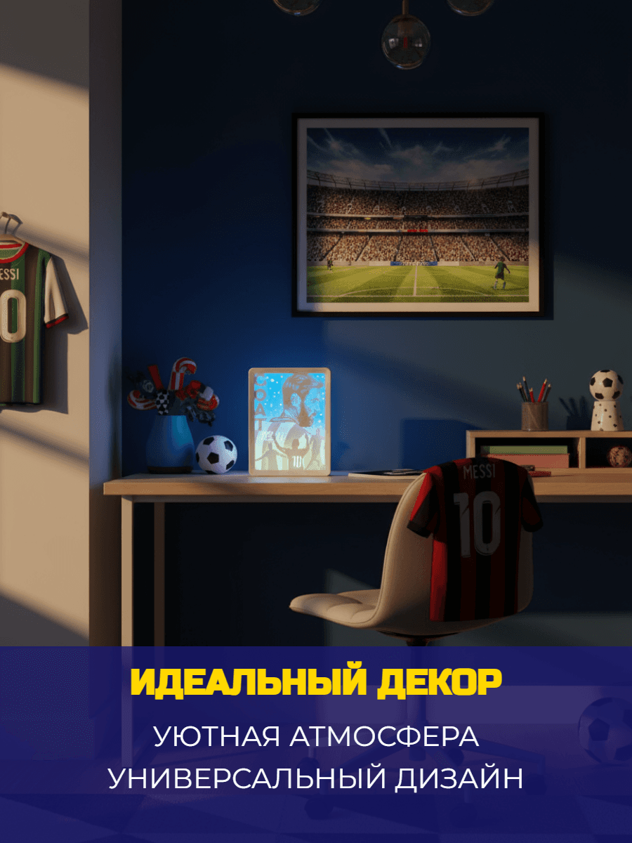 Ночник "Лионель Месси" от ЛАЗЕРМАГ станет стильным и оригинальным дополнением к интерьеру детской, спальни или кабинета. Его 3D-дизайн с анималистичным рисунком создает атмосферу уюта и комфорта, а мягкий желтый свет создает расслабляющую обстановку. Ночник работает от сети и поставляется в комплекте с кабелем Type-C. Он станет отличным подарком для друга, ребенка или сестры на день рождения, Новый год или просто так. Характеристики: Высота 19.5см, Ширина 4см, Длина 14,5см Материал: ABS пластик, бумага Страна изготовления: Китай Вид выпуска: Фабричное изготовление Вес товара: 300 г. Комплектация: Упаковка -1шт. Кабель Type-c 1м белый 1шт. Ночник - 1шт.