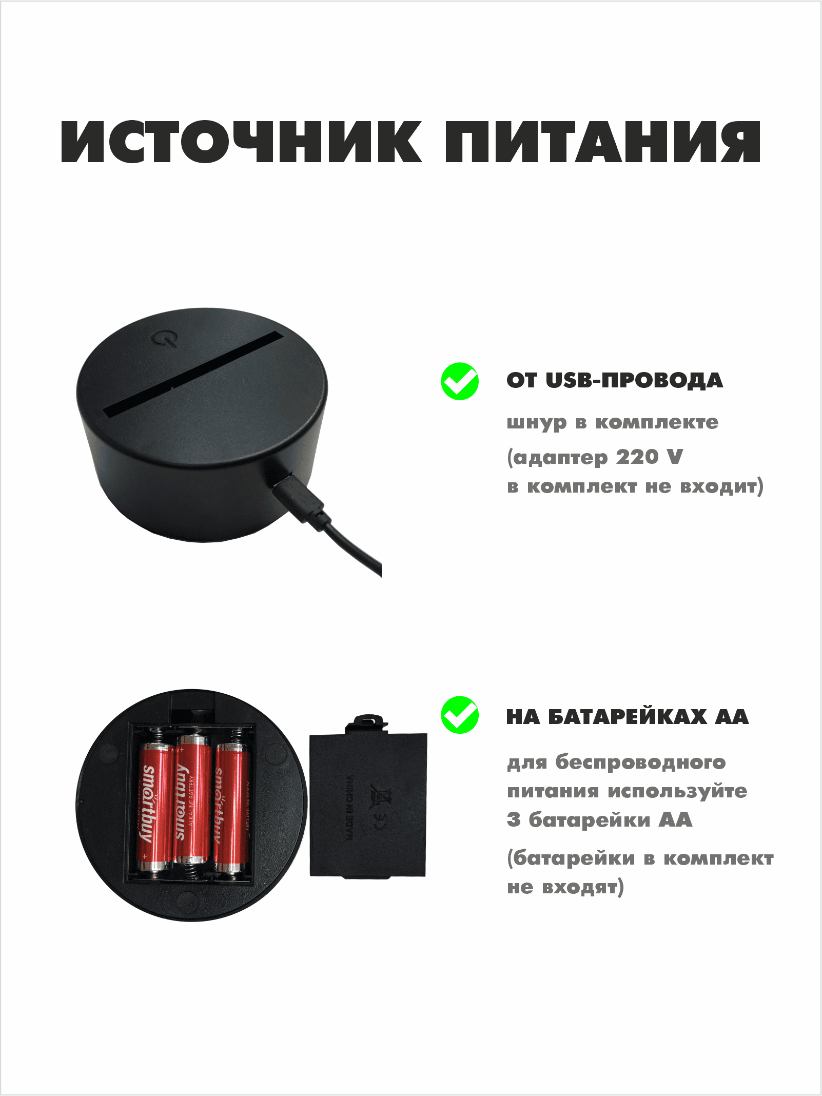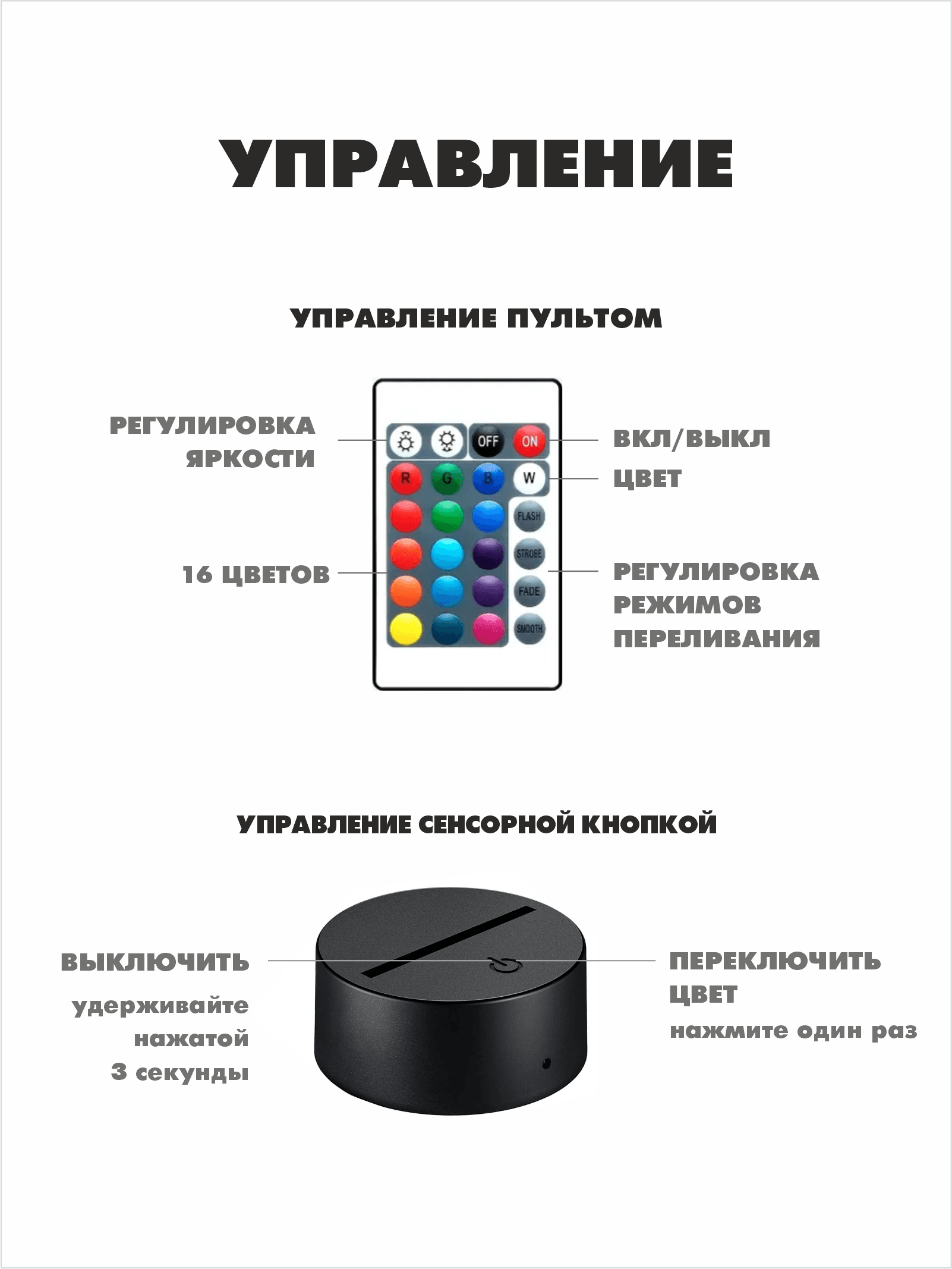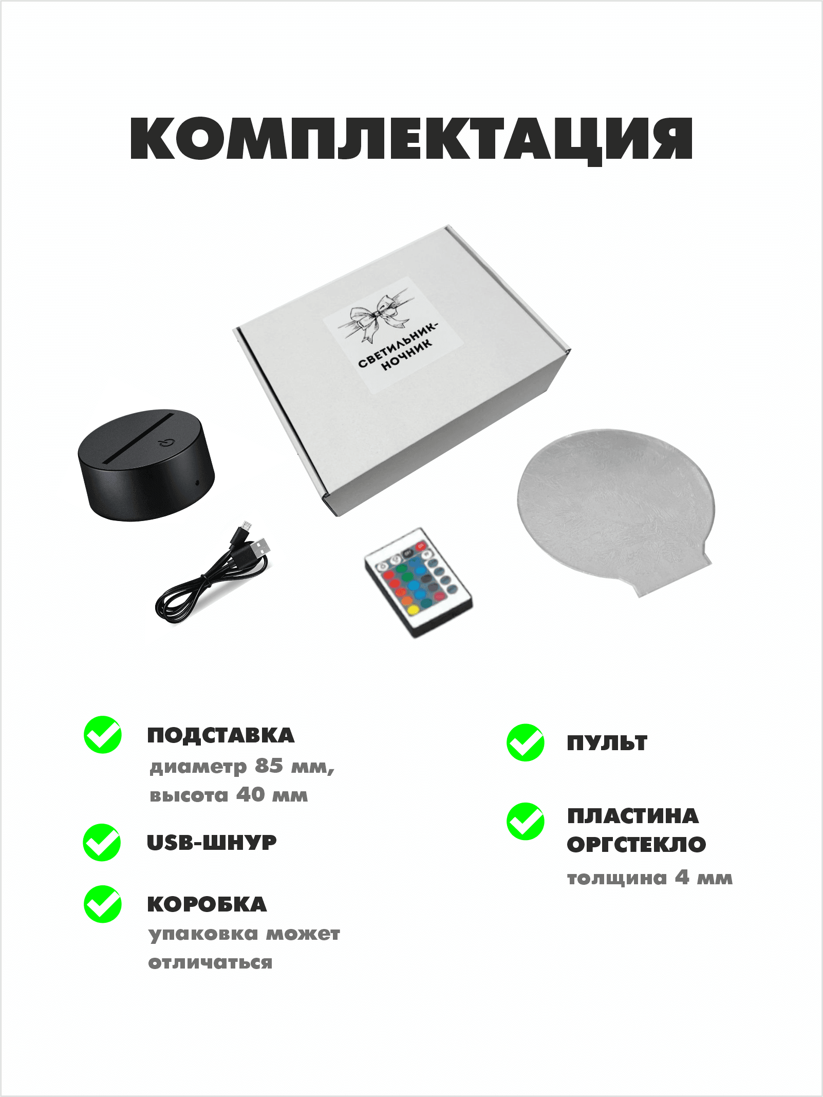 Создайте Уникальную Атмосферу в Вашем Пространстве! Вас привлекает мир света и тени? Тогда наш 3D светильник станет идеальным дополнением для вашего интерьера! Этот стильный и инновационный аксессуар не только наполняет комнату мягким светом, но и создает эффектные 3D-иллюзии, которые удивят вас и ваших гостей. Почему стоит выбрать наш 3D светильник? - Удобство использования: светильник легко включается и выключается, а также имеет несколько режимов яркости. Вы можете настроить его в зависимости от вашего настроения или времени суток. - Подарок с душой: прекрасный вариант для подарка на день рождения, Новый год или любой другой праздник. 3D светильник станет оригинальным подарком, который оценит каждый любитель стиля и комфорта. Не упустите возможность преобразить ваше пространство с помощью нашего 3D светильника! Закажите сейчас и наслаждайтесь уникальным освещением в вашем доме, которое станет не только функциональным аксессуаром, но и стильным элементом декора. Создайте атмосферу, в которой хочется проводить время! Характеристики: Ширина 15см, Длина 20см, Высота 20см Материал: Органическое стекло Страна изготовления: Россия Вид выпуска: Ручная, авторская работа Для кого: Брат,Друзья,Коллега,Любимый Вес товара: 150 г. Комплектация: Пластина - 1 шт.; световая подставка - 1 шт., пульт ду - 1 шт., провод USB - 1 шт.; упаковочная коробка - 1 шт.