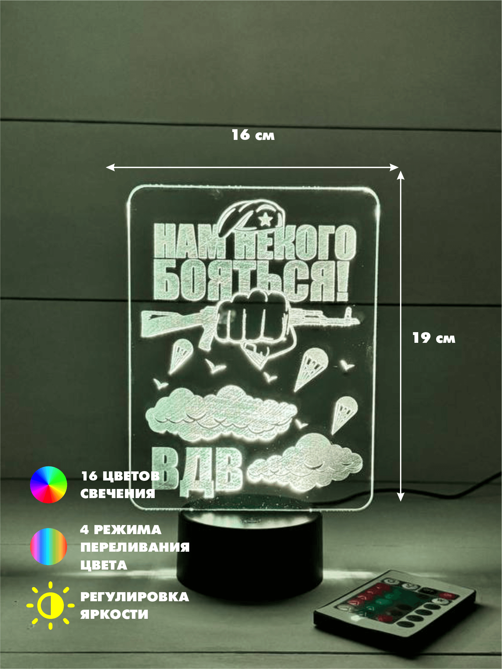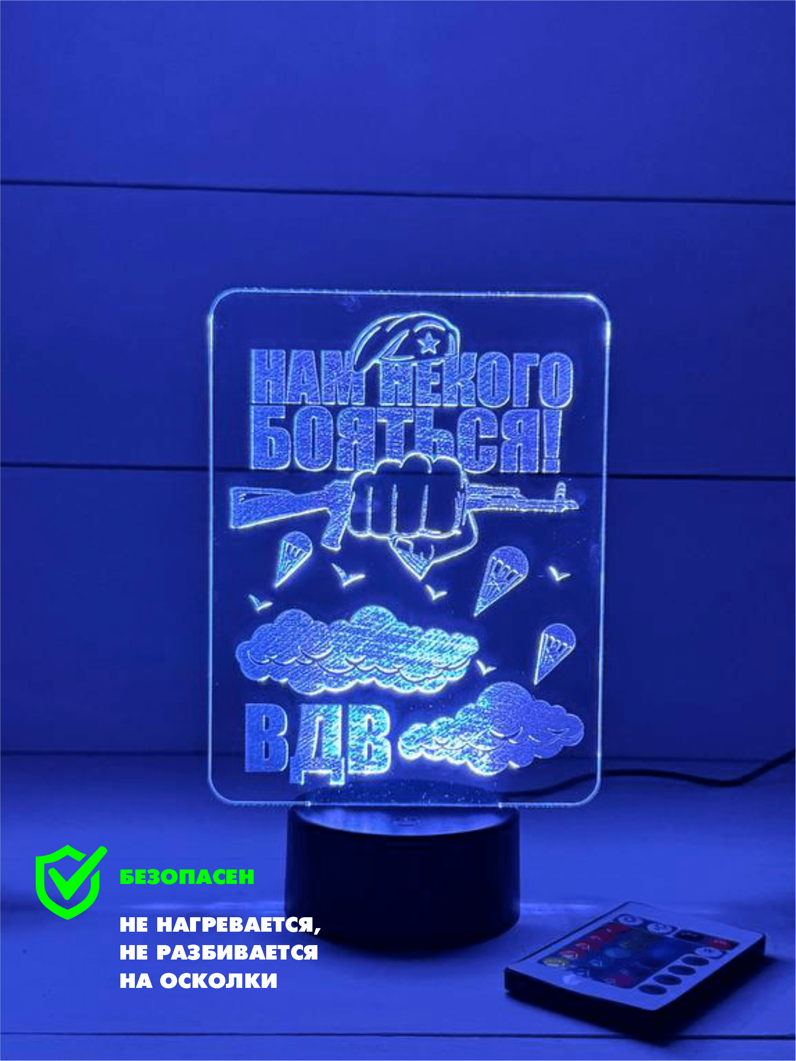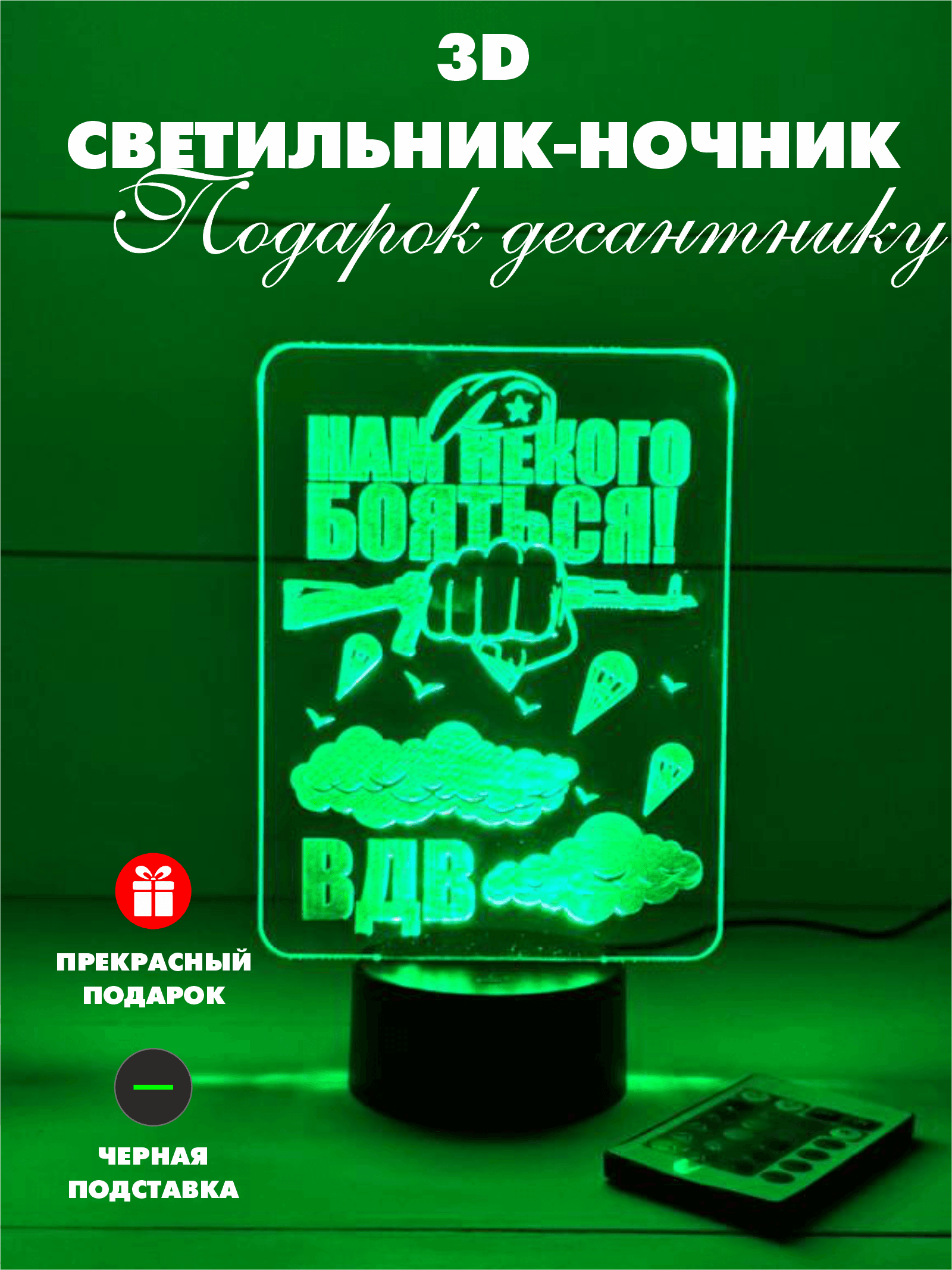3Д Светильник Подарок десантнику, военному 3D Светильник: Создайте Уникальную Атмосферу в Вашем Пространстве! Вас привлекает мир света и тени? Тогда наш 3D светильник станет идеальным дополнением для вашего интерьера! Этот стильный и инновационный аксессуар не только наполняет комнату мягким светом, но и создает эффектные 3D-иллюзии, которые удивят вас и ваших гостей. Почему стоит выбрать наш 3D светильник? - Удобство использования: Светильник легко включается и выключается, а также имеет несколько режимов яркости. Вы можете настроить его в зависимости от вашего настроения или времени суток. - Подарок с душой: Прекрасный вариант для подарка на день рождения, Новый год или любой другой праздник. 3D светильник станет оригинальным подарком, который оценит каждый любитель стиля и комфорта. Не упустите возможность преобразить ваше пространство с помощью нашего 3D светильника! Закажите сейчас и наслаждайтесь уникальным освещением в вашем доме, которое станет не только функциональным аксессуаром, но и стильным элементом декора. Создайте атмосферу, в которой хочется проводить время! Комплектация Пластина - 1 шт.; световая подставка - 1 шт., пульт ду - 1 шт., провод USB - 1 шт.; упаковочная коробка - 1 шт.
